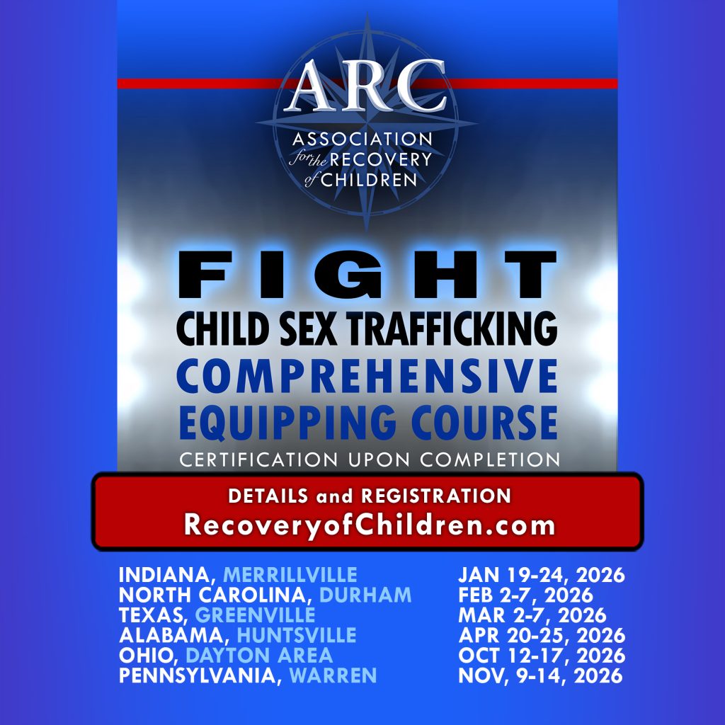 - ARC’s FIGHT Child Sex Trafficking Comprehensive Equipping Course: ARC hosts 6-day training courses all over the US. We train communities—people in all walks of life—how to identify child trafficking victims, how the criminal enterprise of human trafficking works, and how to intervene and rescue victims safely and successfully. DETAILS AT: https://recoveryofchildren.org/training.htm and https://recoveryofchildren.com